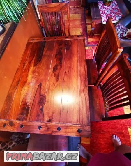 Prodám kuchyňskou soupravu, stůl a 4 židle masiv. V barvě palisandr.