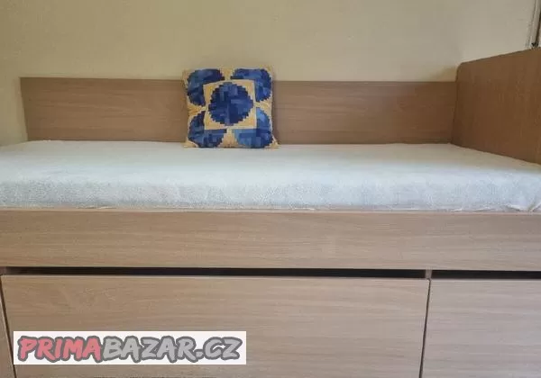 Rohová postel, kvalitní materiál, dva prostorné vysouvací úložné šuplíky a jeden noční stolek s přihrádkami, postel je vyšší, takže se z ní dobře vstává, rošt kvalitní, nic nevrže ani neskřípe. Ložná plocha 90x200. Jediná vada - poškození u jednoho šuplete dole u podlahy (viz foto), jinak bez vad. Pořizovací cena vysoká. Pouze osobní převzetí (okres Beroun).