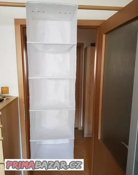 Látkový regál IKEA na zavěšení na tyč do skříně.Výška 120cm,šířka 33cm a hloubka 35cm.