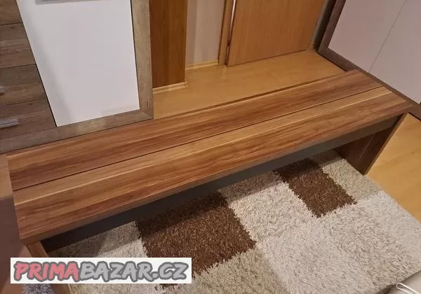 Prodávám lavici v barvě ořechu s černými detaily, rozměry: dl.160, š.34, v.46 cm, bez poškození.