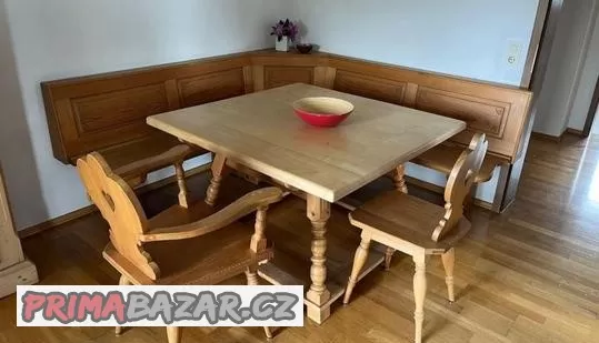 Prodám rohovou lavici se židlemi a stolem(stůl bez horní desky)v masivu