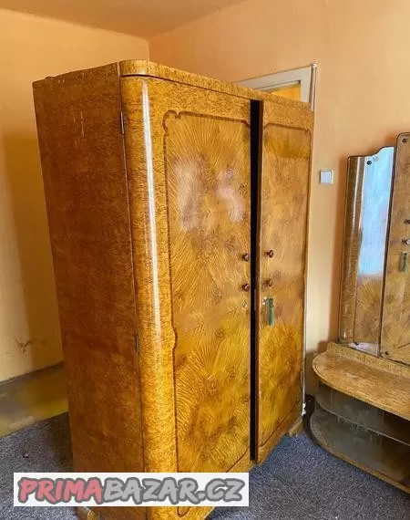 Kompletní ložnice - manželská dvojpostel, šatní skříň dvou a třídveřová, 2x noční stolek, toaletní skříňka se zrcadlem. Velmi zachovalé.