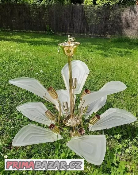Dvoupatrový lustr na 9 svíček 40W. Materiál: kov a sklo. Doporučuji osobní vyzvednutí, ale lze i zaslat (na náklady příjemce), lustr je možné opatrně rozložit a skleněné části zabalit zvlášť.