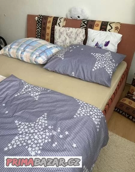 Prodám čalouněnou manželskou postel o rozměrech 180x200cm. Postel je v oranžových a hnědých barvách. K posteli jsou dva polšářky a potah/přehoz ve stejném vzoru jako postel a její čelo. Rošt a obě matrace jsou součástí (funkční). V posteli je úložný prostor pod každou polovinou. Domluva po telefonu(pouze osobní odběr, nezajišťuji rozložení postele ani odvoz). Hovory přijímám po 14 hod.