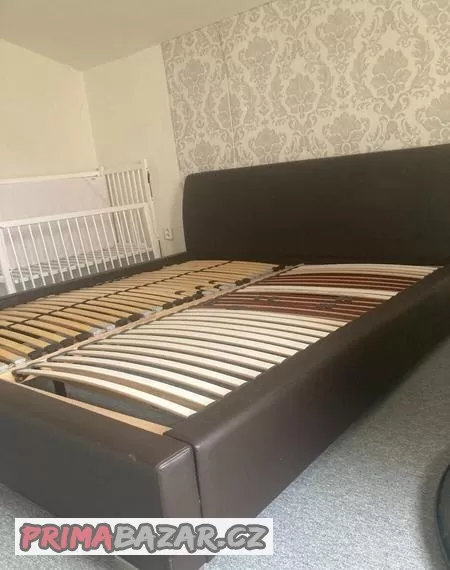Prodám manželskou postel tmavo-hnědá eko kůže, stříbrné nohy. Součástí postele jsou rošty.