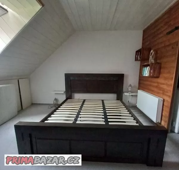 Prodám masivní dřevěnou manželskou postel, včetně roštu, v tmavě hnědé barvě.