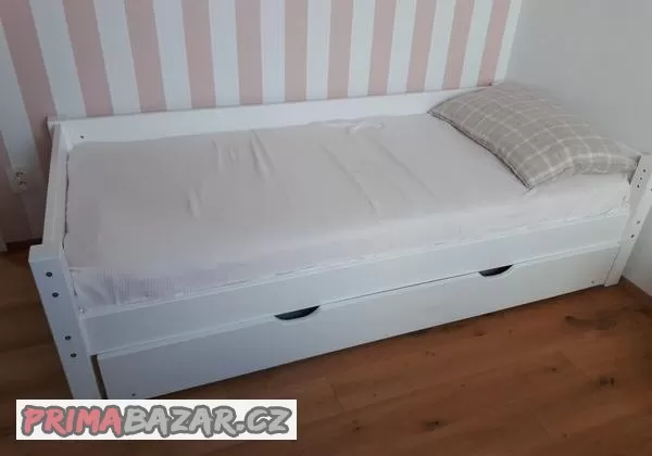 Prodávám v podstatě novou, pouze několikrát využitou, postel z masivu borovice s povrchovou úpravou bílý lak. Rozměry postele jsou d=209,5 cm, š=99,5 cm, v ceně je laťkový rošt pro matraci 90x200 cm. Součástí postele je i zábrana proti vypadnutí dítěte a výsuvná přístýlka (šuplík) s roštem pro matraci o rozměrech 195x90x13 (dxšxv). Zdarma přidám pěnovou matraci 196x90x14 (dxšxv), pouze příležitosně využívanou. Původní cena cca 9000 Kč. Pouze osobní odběr v Náměšti nad Oslavou.