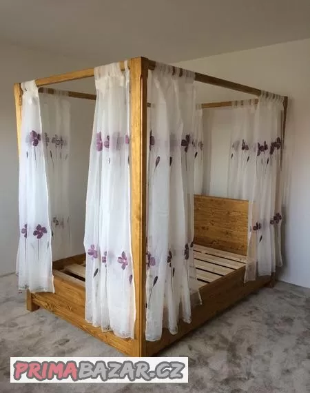 Prodám na zakázku vyrobenou postel s nebesy z masivního smrku, pan truhlář je fachman, který dělá nábytek pro wellness hotel V nebi 5*, tuto postel vyrobil před 4 lety pro dceru, která bohužel tomuto stylu odrostla. Záclonky jsem dokoupila navíc, celkem 8 ks. Jedná se o lůžko 140 cm. Neshledávám žádné vady, žádné odření, nic. Včetně pevných roštů - masivní prkna, a záclon jako bonus (PC 700,- za pár x 4)