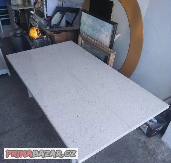 Celková velikost 160x90 , mramorové desky (tl.3cm) jsou na dvě poloviny, mají zespoda dřevěnou desku která zapadne do konstrukce. Výška stolu je 50cm. Konstrukce je u kovových profilu 40x40mm , velikosti jen konstrukce 141x70. Desky bez poškození, všechny hrany v pořádku, konstrukce drobné oděrky. Větší hmotnost na manipulaci.