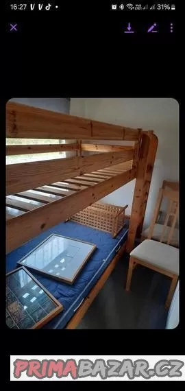 Součástí jsou 2 matrace bílé. Jedna je trochu širší. Měli jsme nahoře. Rozměr palandy je 90 x 200cm. Postel je rozebraná.