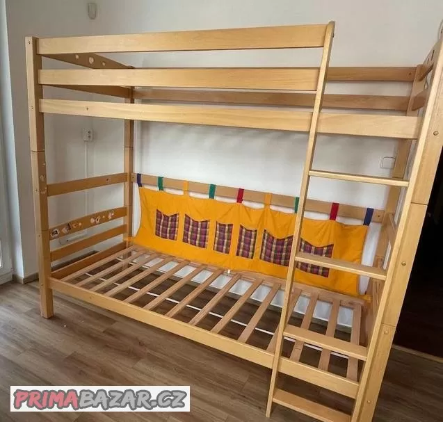 Prodám používanou, ale velice zachovalou patrovou postel s 2 laťkovými rošty. Jako bonus přidám kapsář.