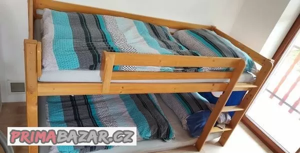 Prodáme patrovou postel masiv smrk pro děti - horní patro se skluzavkou (lze fungovat i bez ní) a případně spodní patro, viz foto