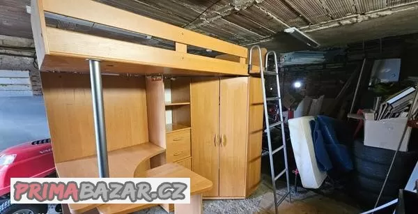 Prodám patrovou postel s šatní skříní a psacím stolem. Nese známky používání. Složeno jen pro foto jinak je postel rozložená a připravena k odvozu. Součástí postele je i matrace.