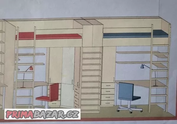 Prodám patrové postele se stoly a skříněmi pro dva sourozence, vhodné do místnosti s výškou stropu 3 m a více. Celkové rozměry: výška 2,66 m od země po horní desku peřiňáku, délka 4,68 m, hloubka 1,22 m. Zábradlí oproti původnímu projektu doplněno do výšky stropu a