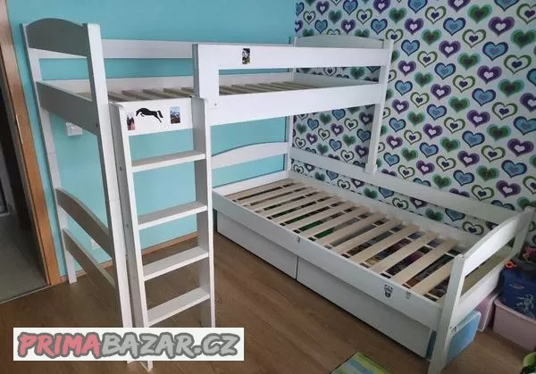 Patrová postel z masivu od českého výrobce. Běžné známky opotřebení, viz.foto. Nálepky lze sundat. Bez matrace. Postele mohou stát i samostatně.