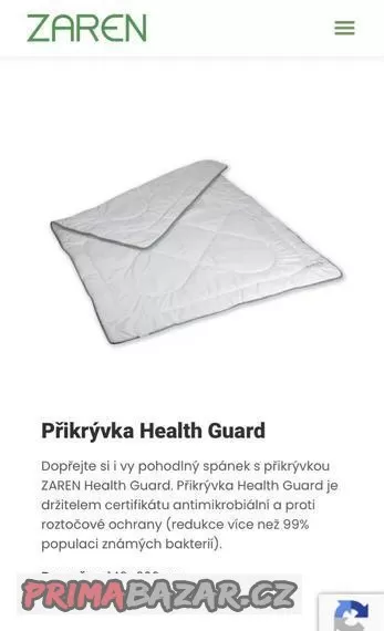 Dopřejte si i vy pohodlný spánek s přikrývkou ZAREN Health Guard. Přikrývka Health Guard je držitelem certifikátu antimikrobiální a proti roztočové ochrany (redukce více než 99% populaci známých bakterií)