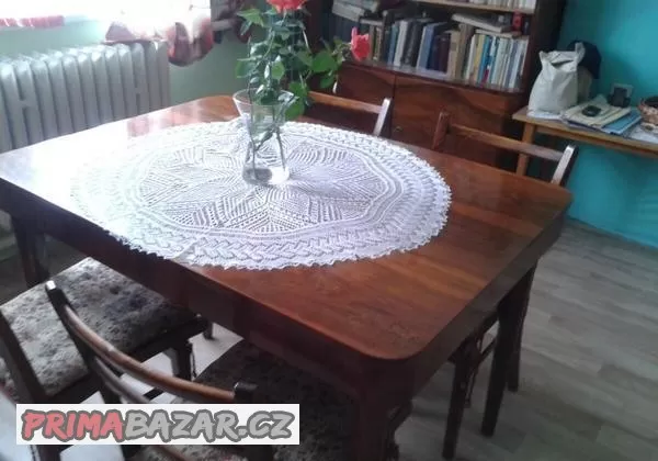Krásný nábytek z 50 - 60 let po rodičích, tmavě hnědý s leskem. Povrchová úprava stolu patří přelakovat. Stůl i se čtyřmi židlemi v ceně 2300 Kč Stůl je rozkládací, rozměry 120cm, šíře 85cm. Vážným zájemcům cenu snížím.