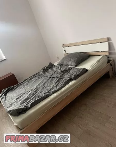 Postel včetně matrace a roštu. Postel je z dřevotřísky motiv dub/bílá. Matrace je pouze pěnová pro přespání na pár nocí stačí, ale na každodenní spaní bych doporučovala pořídit jinou.
