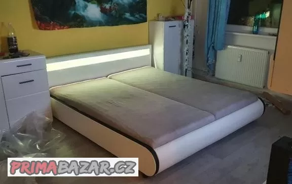 Postel s LED podsvícením rgb včetnĕ matraci , rohy u postele poškrábane od kočiček a rošt nejlépe přivrtat , určitě ještě dobře poslouží, cena nové postele 9000 plus matrace 14tisic