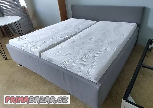 Manželská postel s polstrovaným čelem potaženým pevnou látkou včetně dvou lamelových roštů a kvalitních matrací německé značky Dunlopillo Smart Adapt s jádrem ze studené pěny. Vše NOVÉ, možnost dovozu.
