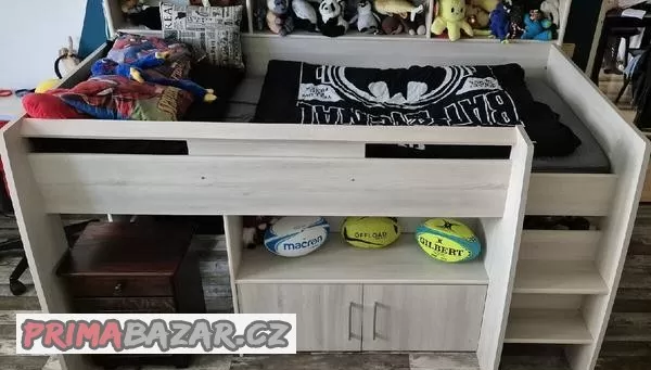 Postel 200x90cm, úložný prostor a poličky. Bez matrace. Rozměry: výška 132cm, 130/213 cm, délka 211cm, lůžko 90x200cm.