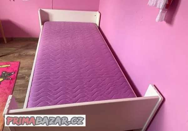 Bílá postel 90x200 cm s roštem a matrací. Povlak na matraci je dá sundat a snadno vyprat. Celková délka postele 205 cm, šířka 102.