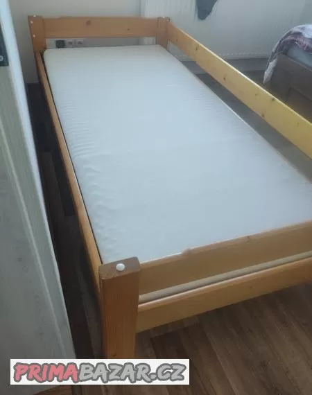 Dřevěná postel se zábranou. Vnější rozměr je 208x98, matrace má 200x90 a 8cm na výšku, zachovalá. Výška postele se zábranou je 57cm, bez zábrany 35cm. Vyzvednout lze v Sedleci. Prodám pouze jako celek.