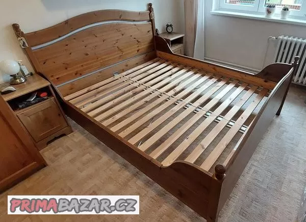 Postel viz. foto včetně roštů v dobrém stavu. Drobné oděrky od běžného užití nejvíce patrné na noze. Pravá strana mírně vyšisovaná od slunce viz. fota.
