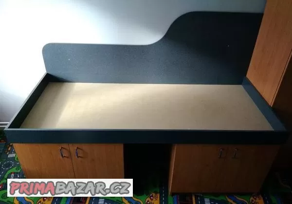 Prodám postel na dvou prostorných skříních (v jedné z nich je jedna police), včetně bočního panelu pro ochranu zdi. Pro rozměry matrace 85 cm x 195 cm.