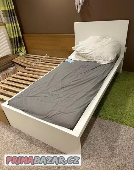 Jednolůžková postel Malm 90x200 z Ikei v bílé barvě, včetně roštu a matrace. Bez povlečení a polštářů.