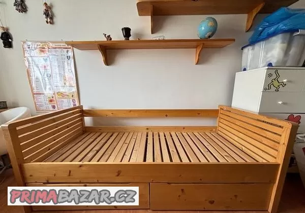 Prodám dvě postele z masivní borovice na matraci 90x200cm s roštem, dvěma šuplíky na kolečkách, šuplíky jsou pod celou postelí, matrace není součástí. Odvoz si zajistí kupující sám.