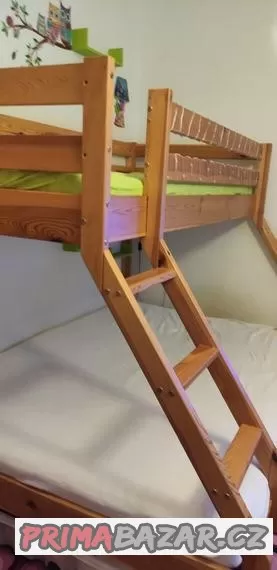 Nabízím k prodeji tuto praktickou postel.Dolni část 140x200cm horní 90x200cm což umožní spaní až pro 3 osoby.Žebřík lze namontovat jak na levou tak pravou stranu dle potřeby. Zboží bude v rozmontovaném stavu. Bez roštu, matrace pouze na spodní část (140x200).