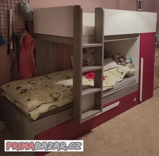 Postel je stará dva roky, součástí postele je velmi prostorná hluboká skříň, místo na spaní nahoře, dole a dá se použít i šuplík na spaní, ale může sloužit i jako úložný prostor. PC 18.000