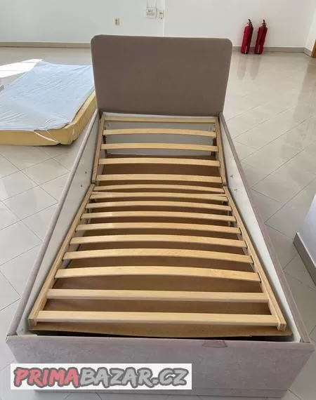 Postel s roštem, matrací a ochranným potahem na matraci