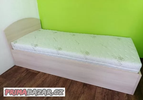 Nabízím jednolůžkovou postel 90x200. Vyrobena z lamina o tloušťce 2,5 cm. Součástí je kvalitní výklopný rošt a matrace (výška 17 cm, z každé strany jiný stupeň tvrdosti). Postel byla používaná minimálně, je jako nová. Vyrobena na zakázku.