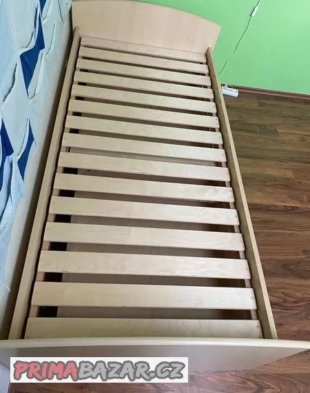 Prodám použitou postel s úložným prostorem a nočním stolkem. Rozměr 90x200 cm. Součástí postele je molitanová matrace v obalu, výška cca 14cm, masívní překližkový nepolohovatelný rošt od f. Jelínek (koupený samostatně), úložný prostor (dvě zásuvky na kolečkách) a noční stolek také se dvěmi zásuvkami. Postel je rozložená, pouze rošt a noční stolek jsou v celku. Ceny při odběru samostaných částí - postel 1.500,-Kč, noční stolek 500,-Kč, rošt 3.400,-Kč, úložný prostor 400,-Kč/kus, matrace 300,-Kč. Při odběru kompletu cena 5.500,-Kč. Dohoda možná.
