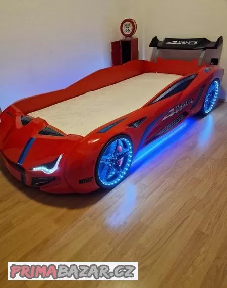 K dispozici je hudební doprovod a zvuky napodobující zapnutí motoru a alarm.Světlo pochází ze světlometů, kol a po obvodu postele. Stav je ideální.