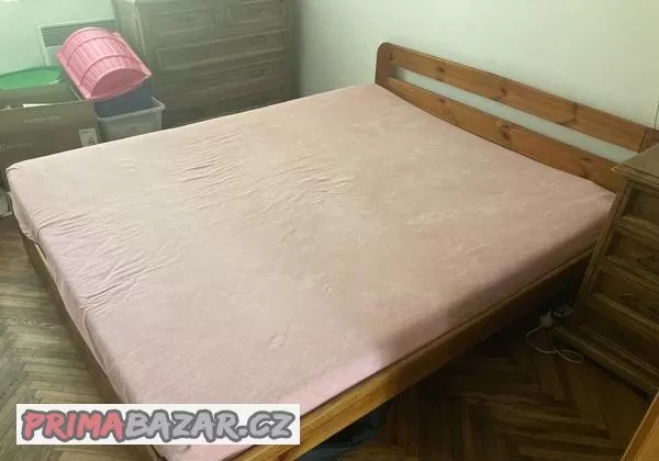 Nabízím manželskou postel z masivní borovice. 200 x 160 cm včetně dřevěného roštu a šuplíku. V ceně starší matrace ( není podmínkou).