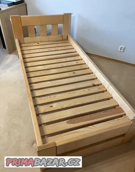 Prodám postel vyrobenou z masivního dřeva javor, rám je z masivního dřeva borovice. Bočnici je možné sejmout, případně umístit na protější stranu. Matrace je od italské firmy Relaxsan s potahem Bamboo Memoform. Výška matrace je 18 cm. Potah je snímatelný a pratelný. Postel je vyrobená na zakázku a má úložný prostor ve spodní části. Součástí prodeje je i noční stolek v/š/h 45/40/30 se zásuvkou. Postel je k dispozici ihned.