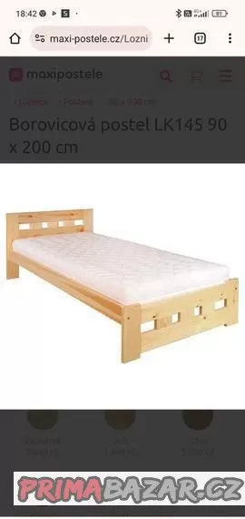 Nabízím k prodeji zánovní postel z masívu,matrace: Pur pěna, měkšší a tvrdší strana, rozměry 90/200 cm. Rošt jsou desky . Původní cena byla 3,5tis.postel a 5,3tis. matrace. Nyní vše za 3990. Odběr Vrbno pod Pradědem