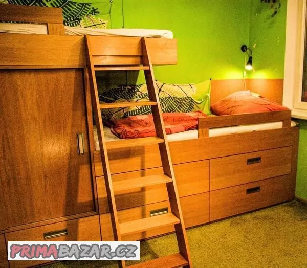 Efektivní řešení do menších prostorů. 2 plnohodnotné postele 200 x 90 cm, 4 velké šuplíky na oblečení. Šatníková skříň s poličkami, aby byla využita celá hloubka skříně a pod ní dva středně velké šuplíky. To vše zabere plochu 350 x 90 cm. Z masívu, vyrobeno na zakázku soukromým truhlářem v Česku.