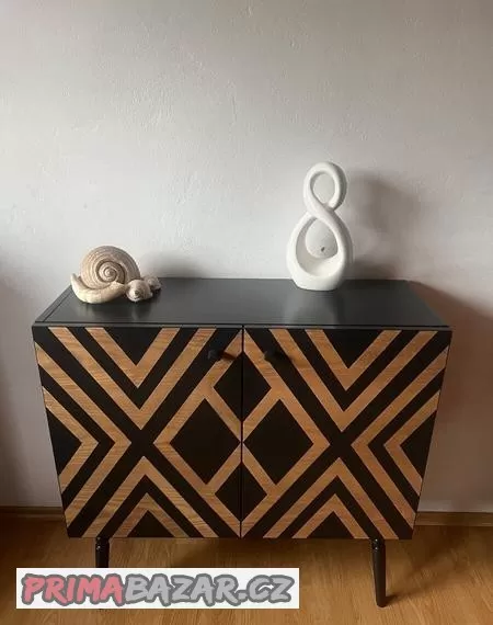 Nabízíme moderně renomovanou skříňku. Jednoduchá kombinace černé barvy s kombinaci geometrického designu napuštěného dřeva ořechem a decentními úchytkami. Díky svému návrhu se hodí jako moderní prvek nejen do obývacího pokoje, chodby, haly, ale také se dá použit jako příborník. Určitě osloví milovníky menších a minimalistických apartmánů. Komoda má dvě dvířka s magnety a dvě police na uskladnění, nádobí, dokumentu, čepic, rukavic a šálu. Komoda je z kvalitní a silné dřevotřísky s masivní dýhou, vysoké nožičky z masivu. Preferuji osobní odběr Třebíč možnost zaslat na vlastní náklady. Cena je 4000Kč. Možnost slevy u rychlého a solidního jednání. Dekuji za Váš zájem.