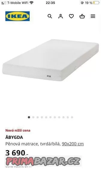 Prodám 2x Matrace Ikea ÅBYGDA. Rozměry matrace jsou 90x200. Tloušťka 16cm. Používaný cca 7 měsíců. Původní cena 3990 za jeden. Cena za oba 3000 kč.