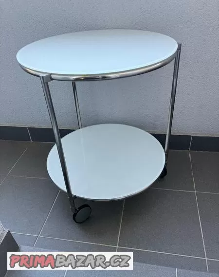 Prodám kulatý odkládací-servírovací pojízdný stolek. Dvě kulaté plochy z matného tvrzeného skla. Stav jako nový. Pouze osobní odběr ve Frýdku-Místku. (Původní cena 999,- Kč)