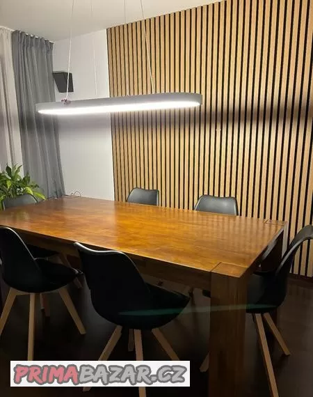 Stůl je pevný, masivní, lakovaný, takže nehrozí žádná kolečka od pití. Je opravdu těžký - nutný odvoz z Vysoké nad Labem. Barva ořech. Žádnou zásadní vadu nemá, samozřejmě drobné škrábanečky tam jsou, ale při běžném používání není vidět a ani se mi nepodařilo nic vyfotit. Ke stolu můžu prodat i 6x jídelní židli za 2800 Kč.