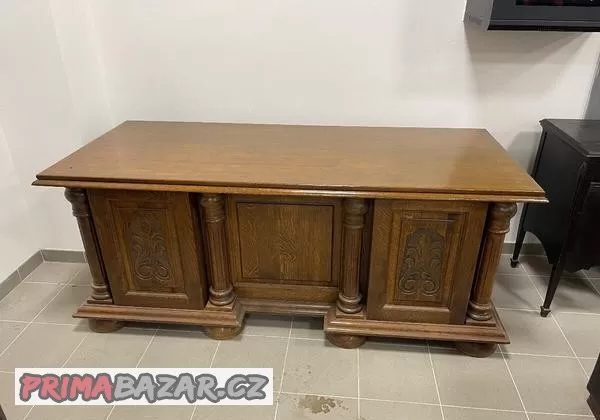 Psací stůl dubový zdobený původní cena 160 tis. Kč nyní jen za 99 tis. Plus nabízím velke psací stoly zdobené Vyroba Polska cena 10 tis. Kč