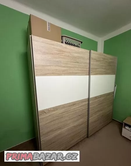 Prodám šatní skříň s posuvnými dveřmi v dekoru dub sonoma / bílá. Skříň je ve velmi pěkném stavu.