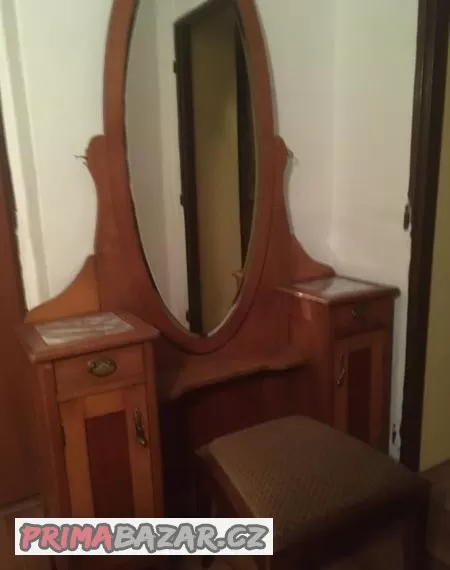 Prodám starožitný nábytek, z roku 1930, dřevo africká bříza, 2x skříň, 2x noční stolek, toaletní stolek se zrcadlem a židličkou,a dále rozložená postel ve stejném stylu jako nábytek na fotkách. Cena za vše.