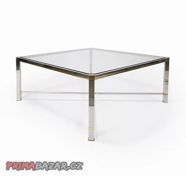 Čtvercový konferenční stolek z osmdesátých let vyrobený z chromované oceli. Nohy podnože jsou propojené křížící se úhlopříčnou výztuží. Stolek má zajímavé detaily z leštěné mosazi v místech spojů jednotlivých chromovaných prvků a také po obvodu skleněné desky. Deska je zasklená čirým sklem, které má drobné uštípnutí viditelné na jedné z fotografií. Stolek je ve výborném původním stavu.