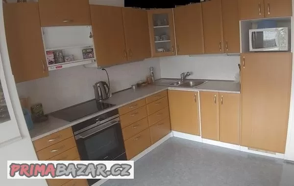 Včetně pracovní desky, nerez dřezu s baterií, odsavačem (Whirlpool, 4 rychlosti), ledničkou s malým mrazákem (Electrolux) a dvou zářivek, u každé jsou dvě el. zásuvky.